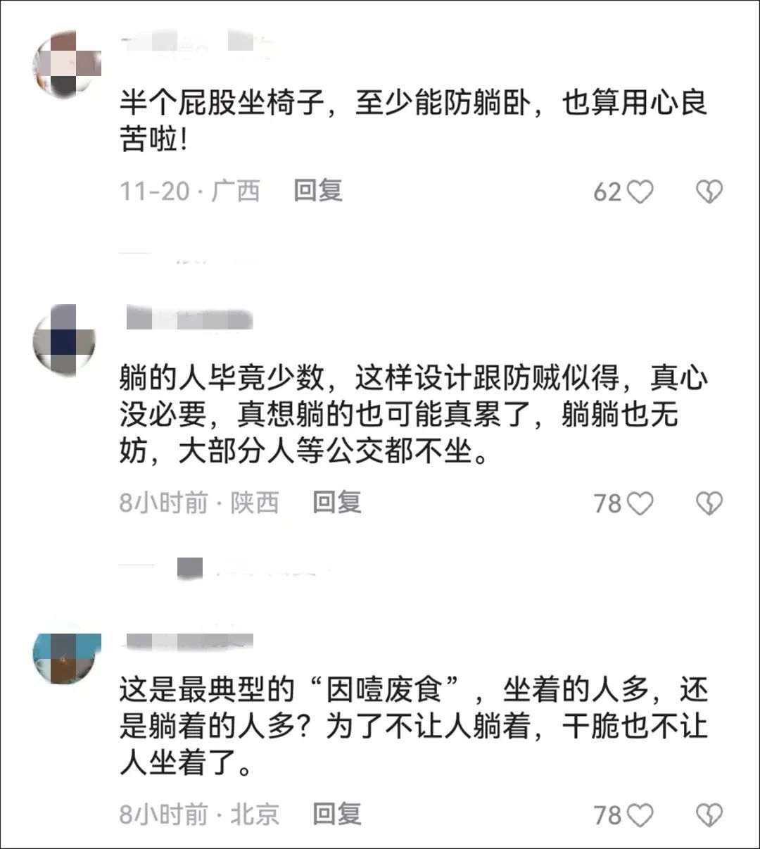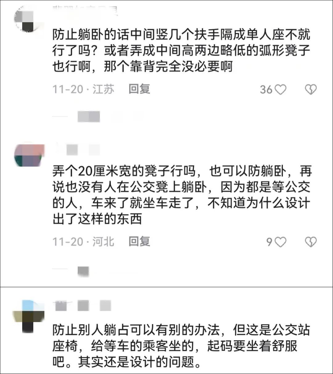 也有网友说,“还是设计的问题”“可以有其他办法防止躺卧”。