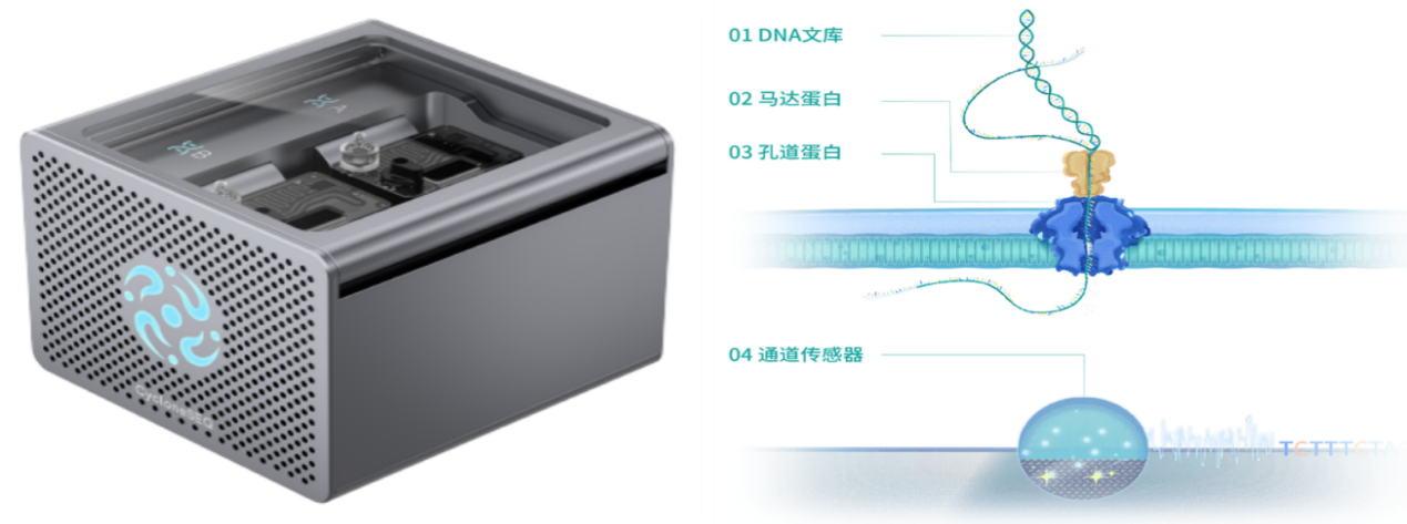 图为纳米孔基因测序仪(左)及其核心组件示意图(右) 由市场监管总局供图